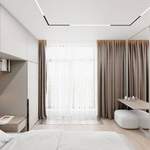 Для функционального использования всего пространства спальни над кроватью предусмотрены шкафы для хранения. В ванной и санузле используется крупноформатный керамогранит для сокращения количества швов и создания эффекта натурального камня.