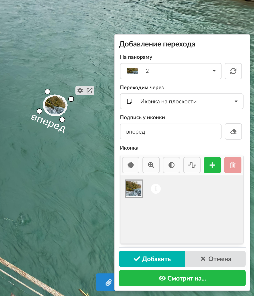 Уже созданные переходы, мы можете в любой момент перемещать по экрану, просто захватив мышкой или пальцем. В любом момент рядом с переходом в редакторе будут две иконки "редактировать" и "перейти". При редактировании, открывается точно такая же панель, которая была при создании перехода, а при переходе, откроет в редакторе та панорама, на которую у нас установлен переход.